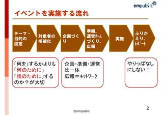 参加型イベント、ワークショップを企画する時、何が大切なのでしょうか? 特に、テーマについて理解を広げ、課題解決への参加を促すために、何が必要なのか、まとめています。 企画書の作成など、ばづくーるアーカイブで情報発信中! http://bazcool.jp/archive4lab