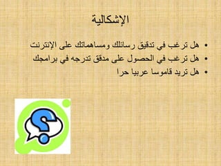 يتناول المستند مشروع إنشاء قاموس عربي للغة العربية يدعم التدقيق الإملائي. المشروع يعتمد على تقنيات البرمجيات الحرة ويهدف إلى تطوير أدوات تدقيق لتسهيل الاستخدام في تطبيقات مختلفة. يشمل المشروع تطوير مزايا جديدة لتحسين عملية التدقيق الإملائي، ويتماشى مع معايير البرمجيات مفتوحة المصدر.