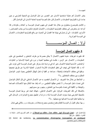الوثيقة تتناول مفهوم الاتصالات في المؤسسات، موضحة أهمية التواصل الداخلي والخارجي ودوره في تحسين فعالية المؤسسة. تتم الإشارة إلى مكونات الاتصالات، وطرق تبادل المعلومات بين الأفراد داخل المؤسسة وخارجها. كما تسلط الضوء على أهداف الاتصالات وكيف تعزز التفاهم والثقة بين العاملين وجمهور المؤسسة.