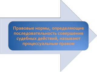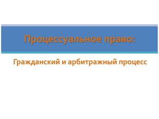 Документ описывает процессуальное право и судебное производство в гражданском и арбитражном процессах РФ, освещая меры признания гражданина недееспособным и основные принципы судебного разбирательства. Он также характеризует различия между гражданским и арбитражным процессами, включая категории дел и виды доказательств. Важными аспектами являются правила обжалования судебных решений и специфические принципы, определяющие деятельность арбитражного суда.