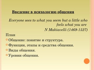 Документ представляет собой введение в психологию общения, описывающее его понятие, структуру, функции и этапы. Основное внимание уделяется коммуникативной компетенции и различным уровням общения, а также особенностям конструктивного и деструктивного поведения. Включены рекомендации по улучшению общения и тесты для самопроверки понимания материалов.