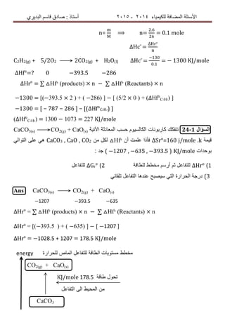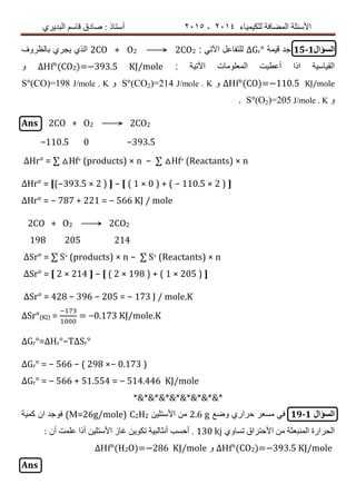 تناقش الوثيقة تفاعل احتراق الغاز وعلم الديناميكا الحرارية، حيث يتم حساب التغيرات في الطاقة الحرة والنشاطية للعديد من التفاعلات الكيميائية. تم تقديم البيانات الحرارية المطلوبة لإجراء الحسابات، وكذلك الصيغ المستخدمة لحساب ΔH وΔG وΔS. تتضمن الوثيقة كذلك توضيحات حول كيفية تأثير المتغيرات مثل الضغط ودرجة الحرارة على وضع التوازن في التفاعلات.