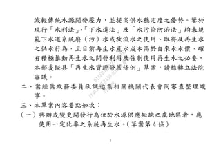 行政院第3450次会议讨论了经济部拟定的《再生水资源发展条例》草案,旨在积极推动再生水的开发和利用,以应对台湾水资源短缺的问题。草案包括对再生水的使用标准、开发程序及政府监管措施的规定,强调了在水源短缺地区使用再生水的必要性。此条例将为促进水资源的可持续利用和相关产业的发展提供法律框架。