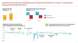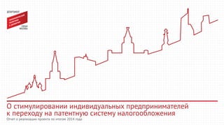 Документ предоставляет отчет о реализации проекта по стимулированию индивидуальных предпринимателей в 2014 году, акцентируя внимание на динамике изменения количества зарегистрированных ИП в Москве и регионах. В нем также анализируется сравнение количества и стоимости патентов по годам и видам деятельности, подчеркивая рост стоимости патентов. Кроме того, обсуждаются изменения законодательства о патентной системе налогообложения, введенные с 2015 года, что привело к выравниванию условий налогообложения малого бизнеса и увеличению поступлений в бюджет города.