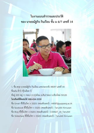 ชั้น ม 6/7 เลขที่ 14 1. ชื่อ-สกุล นายธณัฐกิจ กินเรือน เลขประจาตัว 44097 เลขที่ 14 ชื่อเล่น ต้าร์ กรุ๊ปเลือด บี ที่อยู่ 203 หมู่ 11 ซอย 6 ต.ทุ่งต้อม อ.สันป่าตอง จ.เชียงใหม่ 50120 โทรศัพท์ที่ติดต่อได้ 088-434-3559 ชื่อ Gmail ที่ใช้ในวิชา ง 33201 (คอมพิวเตอร์) : 44097@yupparaj.ac.th ชื่อ facebook ที่ใช้ในวิชา ง 33201 (คอมพิวเตอร์) : Tanutkit Kinruean ชื่อ Blog ที่ใช้ในวิชา ง 33201 (คอมพิวเตอร์) : COM607_14_Tanutkit ชื่อ Slideshare ที่ใช้ในวิชา ง 33201 (คอมพิวเตอร์) : Tanutkit Kinruean