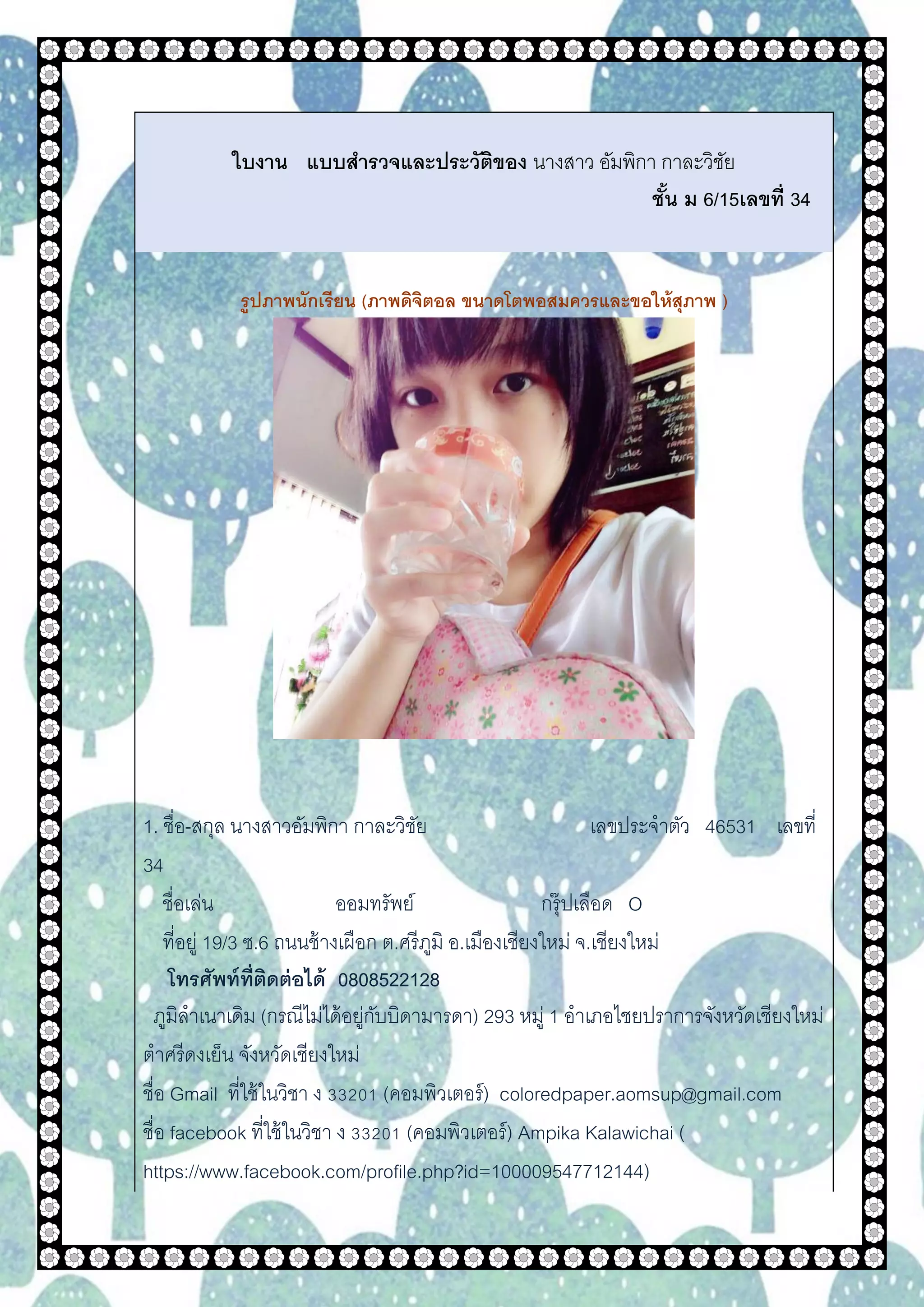 อัมพิกา กาละวิชัย ชั้น ม 6/15เลขที่ 34 รูปภาพนักเรียน (ภาพดิจิตอล ขนาดโตพอสมควรและขอให้สุภาพ ) 1. ชื่อ-สกุล นางสาวอัมพิกา กาละวิชัย เลขประจาตัว 46531 เลขที่ 34 ชื่อเล่น ออมทรัพย์ กรุ๊ปเลือด O ที่อยู่ 19/3 ซ.6 ถนนช้างเผือก ต.ศรีภูมิ อ.เมืองเชียงใหม่ จ.เชียงใหม่ โทรศัพท์ที่ติดต่อได้ 0808522128 ภูมิลาเนาเดิม (กรณีไม่ได้อยู่กับบิดามารดา) 293 หมู่ 1 อาเภอไชยปราการจังหวัดเชียงใหม่ ตาศรีดงเย็น จังหวัดเชียงใหม่ ชื่อ Gmail ที่ใช้ในวิชา ง 33201 (คอมพิวเตอร์) coloredpaper.aomsup@gmail.com ชื่อ facebook ที่ใช้ในวิชา ง 33201 (คอมพิวเตอร์) Ampika Kalawichai ( https://www.facebook.com/profile.php?id=100009547712144)