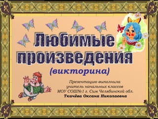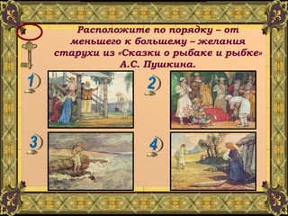 Документ представляет собой презентацию для детей, посвященную русским сказкам и литературным произведениям. Включает викторины, задания и вопросы, связанные с персонажами и сюжетами известных сказок, таких как 'Сказка о рыбаке и рыбке' и 'Чиполлино'. Также представлены ссылки на изображения и звуковые файлы, используемых в процессе обучения.