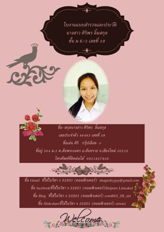ใบงานแบบสารวจและประวัติ นางสาว ศิริพร ลิ้มสกุล ชั้น