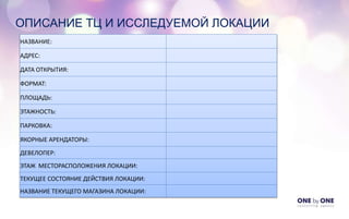 Документ представляет собой комплексную оценку локации для будущего магазина, включая характеристики торгового центра, данные о потоках посетителей и результаты опросов арендаторов и покупателей. Опросы выявляют низкий уровень удовлетворенности соседей по локации по количеству трафика, несмотря на высокие оценки арендаторов на этаже и конкурентов. Прогнозы трафика указывают на 'ниже среднего' уровень посещаемости, что вызывает опасения относительно успешности нового магазина.