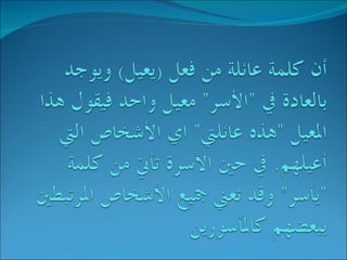الأسرة هي نسق اجتماعي يتكون من الرجل والمرأة والأبناء، ويهدف إلى إنجاب الأطفال وتكوين علاقات قوية بينهم. تتنوع أشكال الأسر في المجتمعات العربية، ومنها الأسرة الممتدة والأسرة النووية، حيث تتسم الأسرة الممتدة بالقوة والاعتماد المتبادل بين الأجيال، بينما تتسم الأسرة النووية بالاستقلالية. تحت تأثير التغيرات الاجتماعية والاقتصادية، تواجه الأسرة الممتدة تحديات قد تؤدي إلى تراجع دورها في المجتمعات الحديثة.