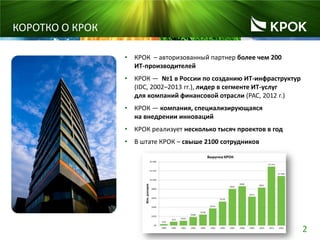 Документ обсуждает важность демократии в корпоративной культуре совместно с жесткими стандартами финансовой отчетности на примере компании Крок. Основные аспекты включают три ключевых направления бизнеса: люди, проекты и инновации, акцент на внедрение новых решений, а также переход финансового отдела от роли контролера к управлению. Представлены выводы о влиянии данных факторов на работу финансистов и необходимости адаптации к динамичным условиям рынка.