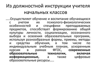 Документ рассматривает современные педагогические технологии как инструменты реализации Федерального государственного образовательного стандарта (ФГОС) для начальных классов. Он акцентирует внимание на разнообразных методах и подходах, таких как проблемное, проектное, и разноуровневое обучение, а также на значении информационно-коммуникационных технологий в образовательном процессе. Основная цель использования этих технологий заключается в активизации познавательной деятельности учащихся, формировании навыков сотрудничества и критического мышления.