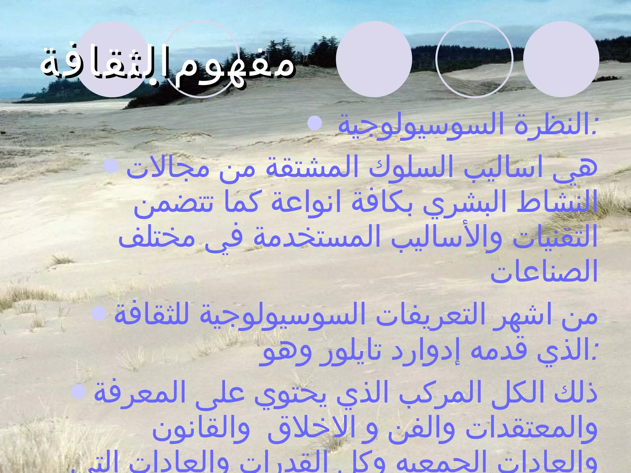 تستعرض الوثيقة مفهوم الثقافة وفقًا للنظرة السوسيولوجية، حيث تعرفها إدوارد تايلور على أنها الكل المركب من المعرفة والمعتقدات والفنون والأخلاق والقوانين والعادات. تمتلك الثقافة مكونات متعددة تشمل المعنوية والمادية والعلاقات الاجتماعية، كما أنها تتميز بالاستقلالية عن الأفراد وتنتقل عبر الأجيال لتشكل التراث. تحتوي الثقافة على جوانب قيمة فريدة تميز كل مجتمع عن غيره، مثل الثقافة العربية، مما يسهم في تماسك واستقرار المجتمع.