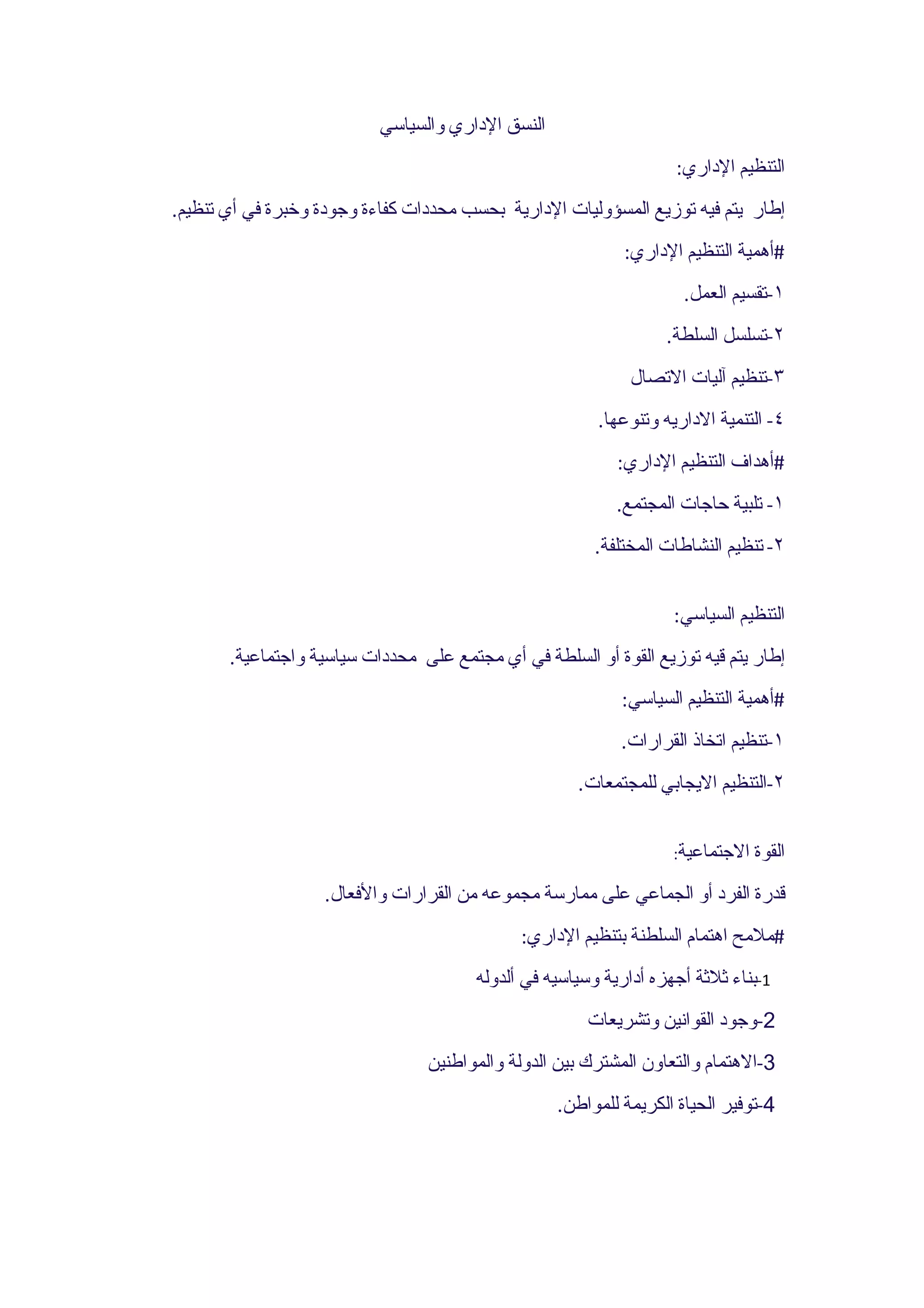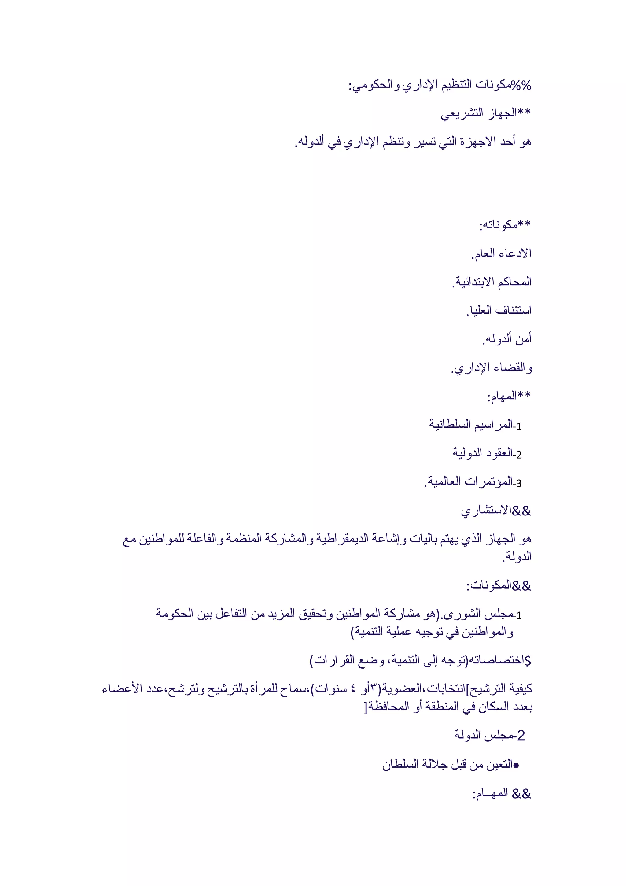 يتناول الوثيقة التنظيم الإداري والسياسي في السلطنة، حيث يوضح أهمية التنظيم الإداري في توزيع المسؤوليات وتلبية احتياجات المجتمع، ويشير إلى أهداف التنظيم السياسي في تنظيم اتخاذ القرارات. كما يستعرض مكونات النظام الاقتصادي وأهم إنجازاته، بما في ذلك القطاعات النفطية، الغاز الطبيعي، التجارة، والصناعة، مع التركيز على أهمية الزراعة والثروة الحيوانية والسمكية. يُبرز الوثيقة أيضاً اهتمام السلطنة بتطوير السياحة كمصدر هام للدخل وتوفير الفرص الوظيفية.