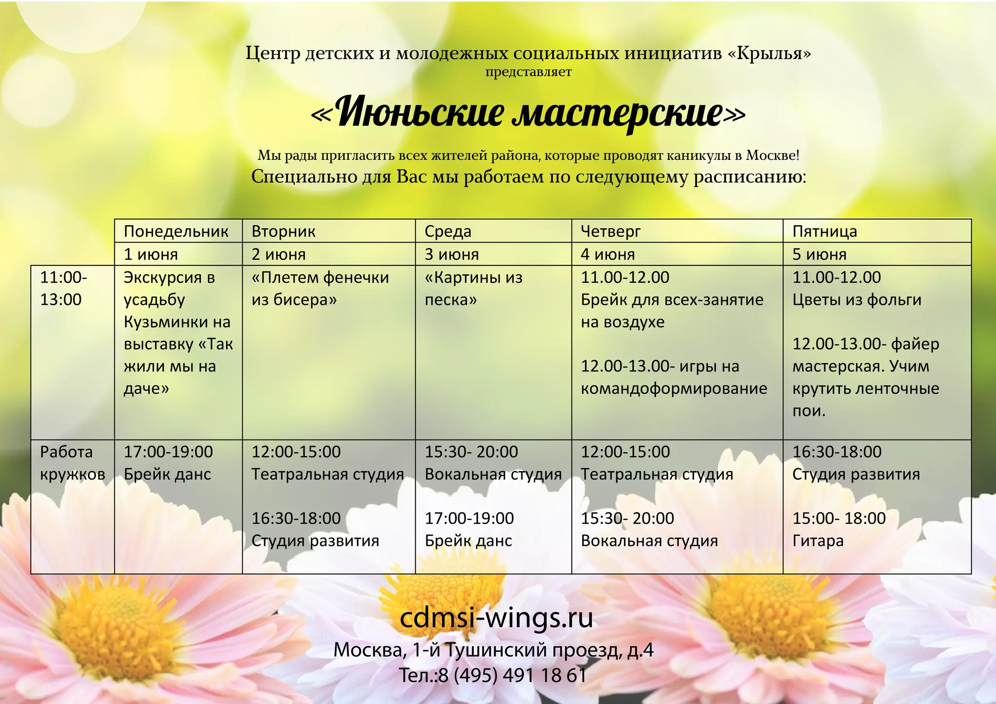 Центр детских и молодежных социальных инициатив «Крылья» предлагает разнообразные мероприятия на июнь для детей и подростков, включая экскурсии, мастер-классы и кружки. Расписание охватывает различные дни и часы, предлагая такие занятия, как брейк-данс, театральная студия, вокальные занятия и ручные работы. Для участия в некоторых мероприятиях требуется предварительная запись.