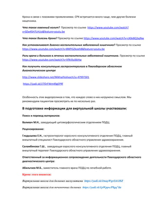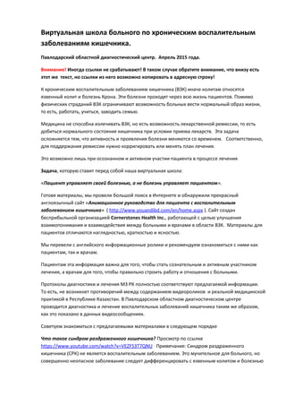 Документ описывает виртуальную школу для пациентов с хроническими воспалительными заболеваниями кишечника, предоставляющую ресурсы для активного участия пациентов в их лечении. Он акцентирует внимание на важности осознания пациентами своей болезни и включает переведенные видеоматериалы, которые помогают пациентам и врачам понимать, как управлять заболеваниями, такими как язвенный колит и болезнь Крона. Также приводятся ссылки на медицинские ресурсы и информацию о диагностике и лечении в Павлодарском областном диагностическом центре.