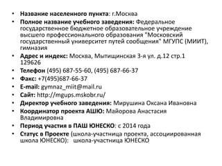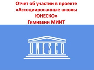 Документ является отчетом об участии гимназии МИИТ в проекте 'ассоциированные школы ЮНЕСКО', который продолжается с 2014 года. В нем описываются достижения учеников в различных конкурсах и олимпиадах, а также информация о руководстве и координаторе проекта. Гимназия активно участвует в событиях, способствующих развитию творческих и учебных навыков студентов.