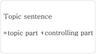 The document provides examples of topic sentences that introduce how-to instructions for changing a flat tire, soothing a crying baby, and making pizza. It notes that effective topic sentences include a topic, controlling part that provides context for why the instructions are needed, and a transition word like "if" to connect the topic and controlling part. The final example given is a topic sentence for saving battery life on an iPhone by following advice.