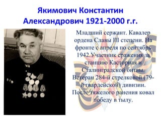 Документ представляет собой биографии участников Великой Отечественной войны, многие из которых удостоены наград за свои подвиги. Включает информации о военнослужащих разных рангов и их участии в важных сражениях, таких как Сталинградская битва, освобождение Украины и боях за Белоруссию. Каждый из перечисленных ветеранов оставил значительный след в истории войны и продолжил трудовую деятельность после ее окончания.