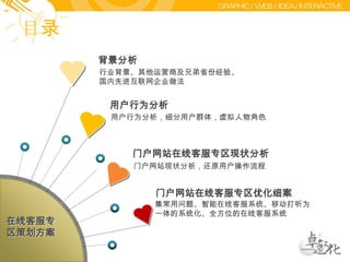 该文档提出了在线客服专区的策划方案,旨在优化现有的客服系统以适应用户需求。在分析行业背景和用户行为的基础上,文档建议整合常见问题解答、智能在线客服和移动互助系统为一体的综合客服方案,重点提升用户体验和服务效率。通过引入卡通形象‘帮帮’和‘问问’,强调友好互动,塑造优质的客服品牌形象。