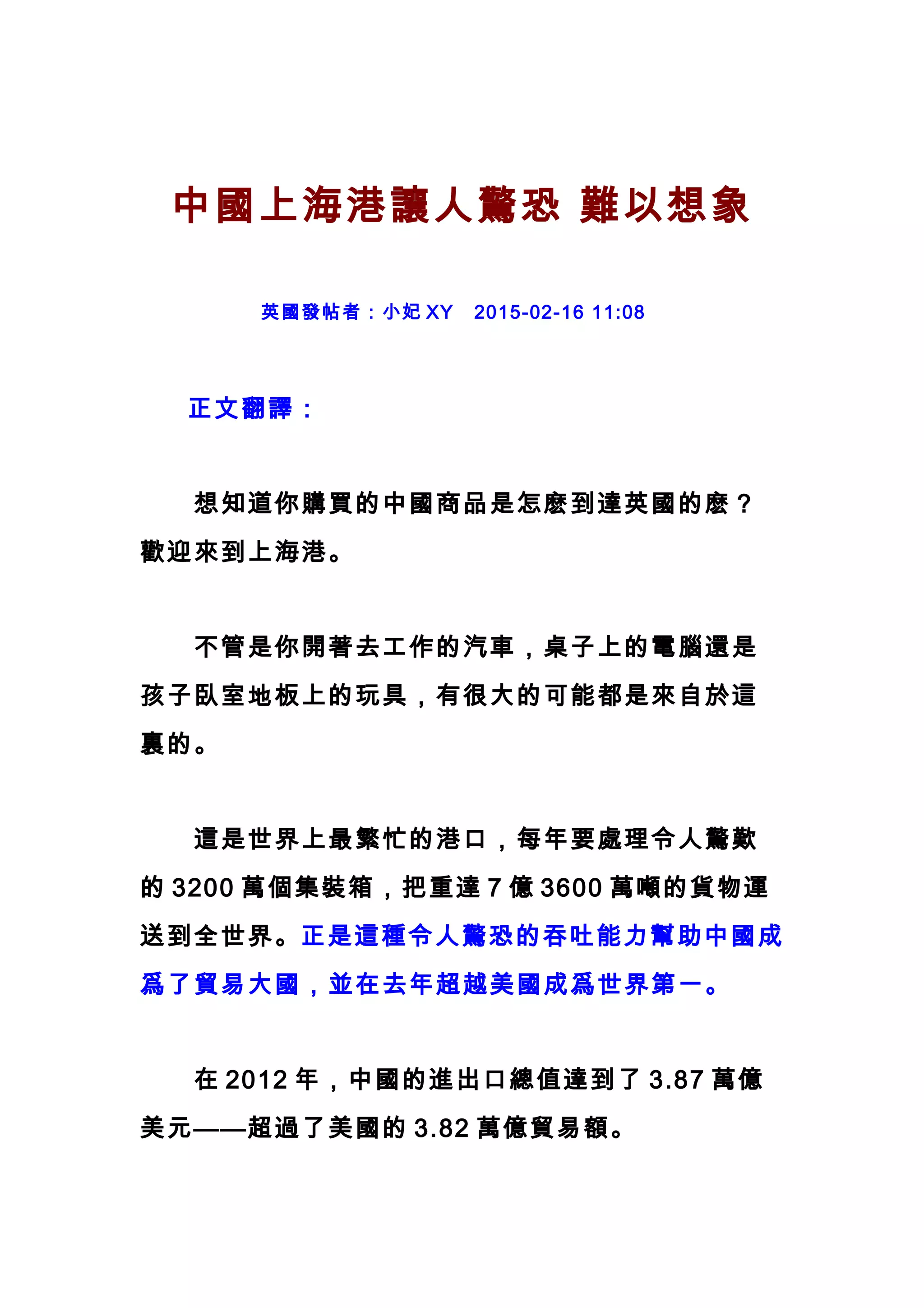 上海港是全球最繁忙的港口,每年处理3200万个集装箱,助力中国成为贸易大国。随着中国制造的普及,西方经济受到挑战,许多产品来源于中国,影响了本国制造业。中国海军最近访问英国,以促进双边军事理解和合作,反映了中国在全球海洋贸易中的重要性。