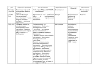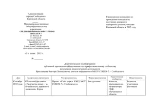 Документ представляет собой отчет о публичной презентации педагогической деятельности Виктора Леонидовича Ярославцева, учителя информатики средней школы №7 города Слободского, включая различные мероприятия, конференции и конкурсы, в которых он принимал участие с 2010 по 2015 годы. В нем перечисляются проекты и достижения, связанные с информатизацией образования, использованием свободного программного обеспечения и проведением мастер-классов. Документ также содержит информацию о взаимодействии с педагогическим сообществом и общественностью через различные интернет-ресурсы и публикации.