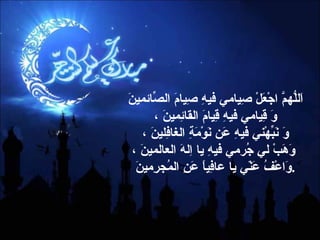 تتضمن الوثيقة مجموعة من الأدعية المأثورة لشهر رمضان المبارك، حيث تعبر عن طلب المغفرة والرحمة من الله وتهدف إلى تعزيز الروحانية والتقرب إلى الله. تزخر الأدعية بالتعبيرات عن الحاجة للثبات في الصيام والقيام، وطلب التوفيق للصالحات وتجنب المعاصي. يُشدد في الأدعية على أهمية استغلال بركات الشهر الكريم وطرق العبادة المستحبة.