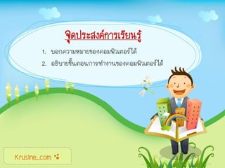 จุดประสงค์การเรียนรู้ 1. บอกความหมายของคอมพิวเตอร์ได้ 2. อธิบายขั้นตอนการทางานของคอมพิวเตอร์ได้ Krusine_com