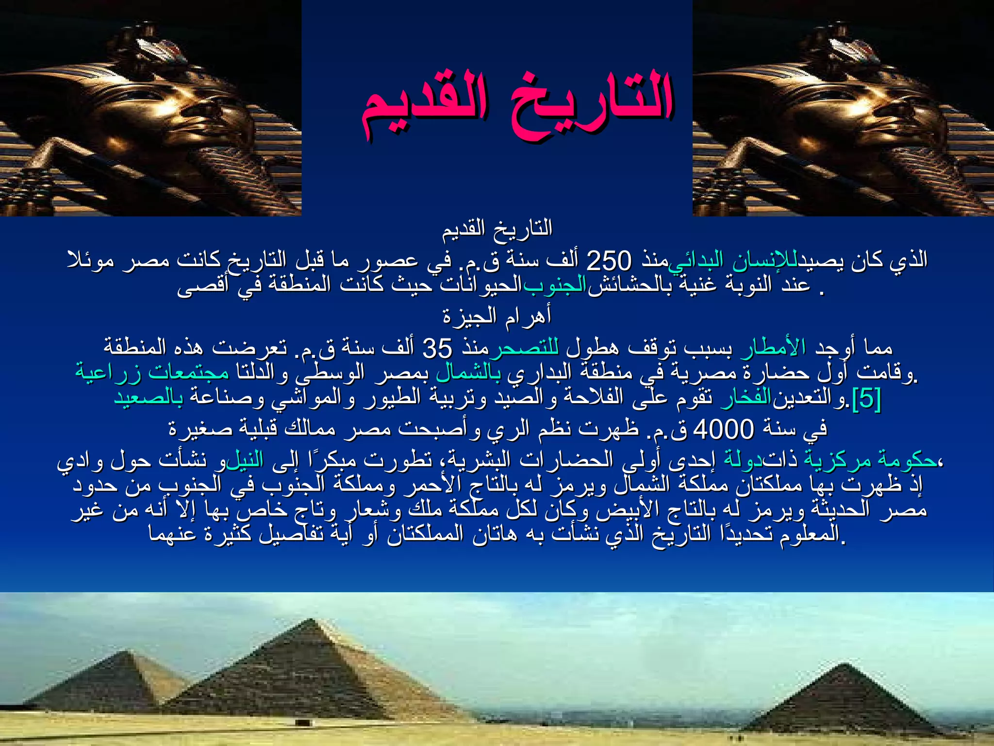 تاريخ مصر يمتد عبر العصور، بدءًا من العصور ما قبل التاريخ إلى العصور الحديثة. شهدت مصر عدة تحولات سياسية وثقافية، بدءًا من ظهور أولى الحضارات في وادي النيل، وتوحيد مملكتي الشمال والجنوب، مرورًا إلى الاحتلال الإغريقي والروماني، وصولاً إلى الحقبة الإسلامية ثم الاستقلال عن الاستعمار البريطاني. في العصر الحديث، شهدت مصر تطورات كبيرة تحت حكم محمد علي الكبير، بعدها انتهاء الملكية وإعلان الجمهورية، مع عدة تحديات على الصعيدين الداخلي والخارجي.
