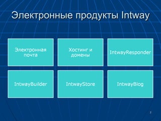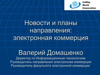 Документ содержит информацию о деятельности компании Intway в сфере электронной коммерции, включая различные электронные сервисы и образовательные курсы. Анонсируются мероприятия, связанные с Днем электронной коммерции, а также предоставляются сведения о новых продуктах и идеях в данной области. Упоминается значимость интернет-магазинов и онлайн-обучения для повышения компьютерной грамотности.