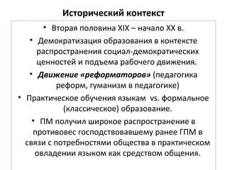 Документ освещает происхождение и развитие прямого метода (ПМ) в языковом обучении, который появился в контексте демократизации образования и потребностей общества в практическом овладении языком. Важнейшими идеями стали акцент на устном общении, удаление формализма и индивидуальный подход к учащимся, что оспорило традиционные методы. Ключевыми фигурами данного движения являются Вильгельм Фиетор и Максимилиан Берлиц, чьи методики продвигали полное погружение и акцент на практике.