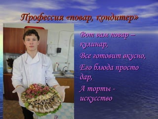 Профессия повара и кондитера является одной из самых важных и необходимых в мире, так как без пищи не может обойтись ни один человек. Эта работа требует не только знаний и навыков, но и творческого подхода, чтобы удивлять посетителей. Талантливый повар стремится доставлять радость людям, используя свои уникальные отношения к продуктам и кулинарное искусство, которое формируется на протяжении многих лет обучения и практики.