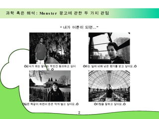 과학 혹은 해석: Monster 광고에 관한 두 가지 관점 “ 하는 일에 비해 낮은 평가를 받고 싶어요 .” “ 상사가 하는 말에는 무조건 동의하고 싶어요 .” “ 아첨을 잘하고 싶어요 .” “ 일은 똑같이 하면서 돈은 적게 벌고 싶어요 .” “ 내가 어른이 되면…”