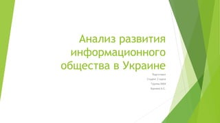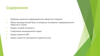 Документ представляет анализ проблем и достижений развития информационного общества в Украине, включая цифровое неравенство, проблемы правового регулирования и безопасность информации. Рассматривается законодательная база и ключевые индексы, такие как индекс сетевой готовности, глобальный инновационный индекс и индекс развития электронного правительства, где Украина демонстрирует низкие позиции по сравнению с другими странами. Основное внимание уделяется стремлению построить информационное общество, ориентированное на интересы людей и открытое для доступа к информации.