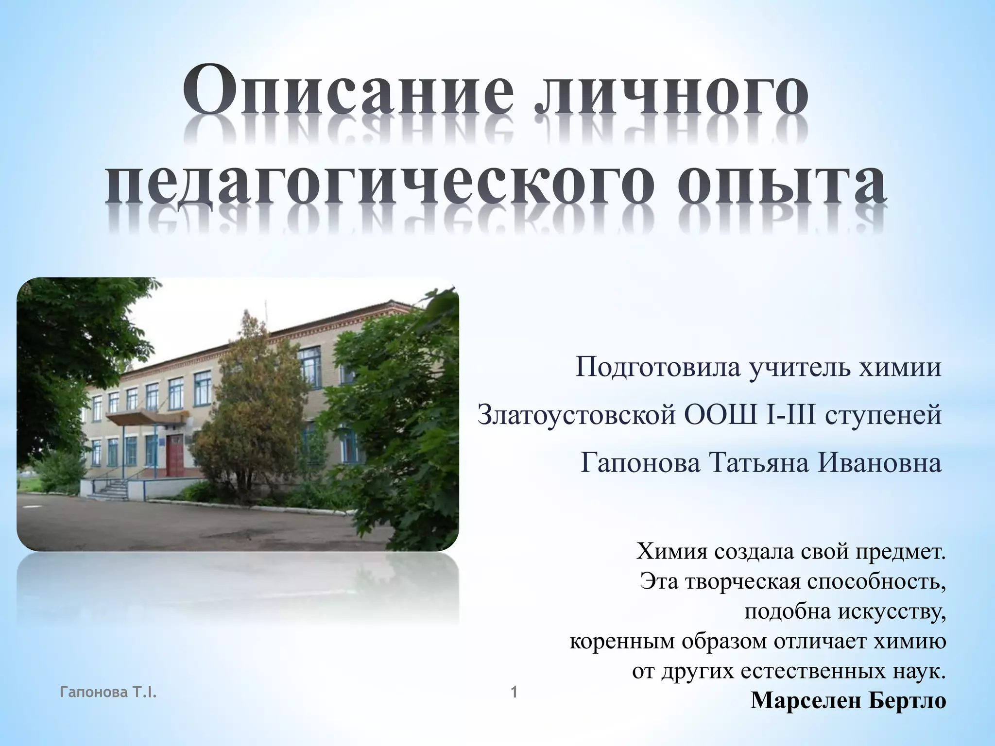Татьяна Ивановна Гапонова, учитель химии с 10-летним педагогическим стажем в Златоустовской школе, разработала методику преподавания химии с применением компьютерных технологий. Она акцентирует внимание на важности индивидуальности каждого ученика и стремится развивать исследовательские навыки с использованием интерактивных подходов. Гапонова имеет высшую квалификационную категорию и активно работает над улучшением учебного процесса.