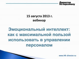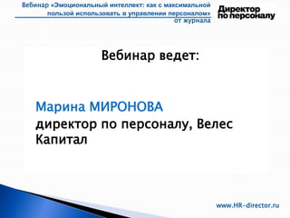 Вебинар, проведенный Мариной Мироновой, директором по персоналу компании 'Велес Капитал', посвящен использованию эмоционального интеллекта в управлении персоналом. Основное внимание уделяется применению знаний об эмоциях для повышения эффективности работы с сотрудниками, в том числе в рекрутинге, обучении и корпоративной культуре. Вебинар подчеркивает важность личных контактов и эмоционального взаимодействия в процессах менеджмента и мотивации.