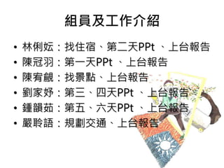 文档详细介绍了一个从嘉义到阿里山再到台南的美食和文化旅游行程,包括每一天的活动安排、餐饮推荐和交通信息。参与者各自负责不同的PPT和报告,行程中体验了阿里山的自然美景和当地特色美食。每项活动的费用都被记录下来,形成了一个完整的旅行预算和行程规划。