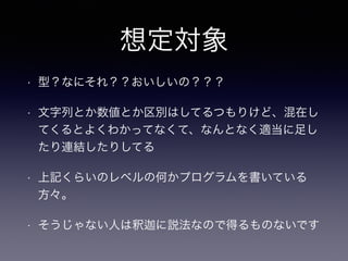 想定対象 • 型?なにそれ??おいしいの??? • 文字列とか数値とか区別はしてるつもりけど、混在し てくるとよくわかってなくて、なんとなく適当に足し たり連結したりしてる •