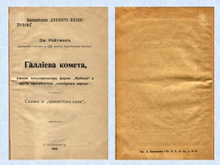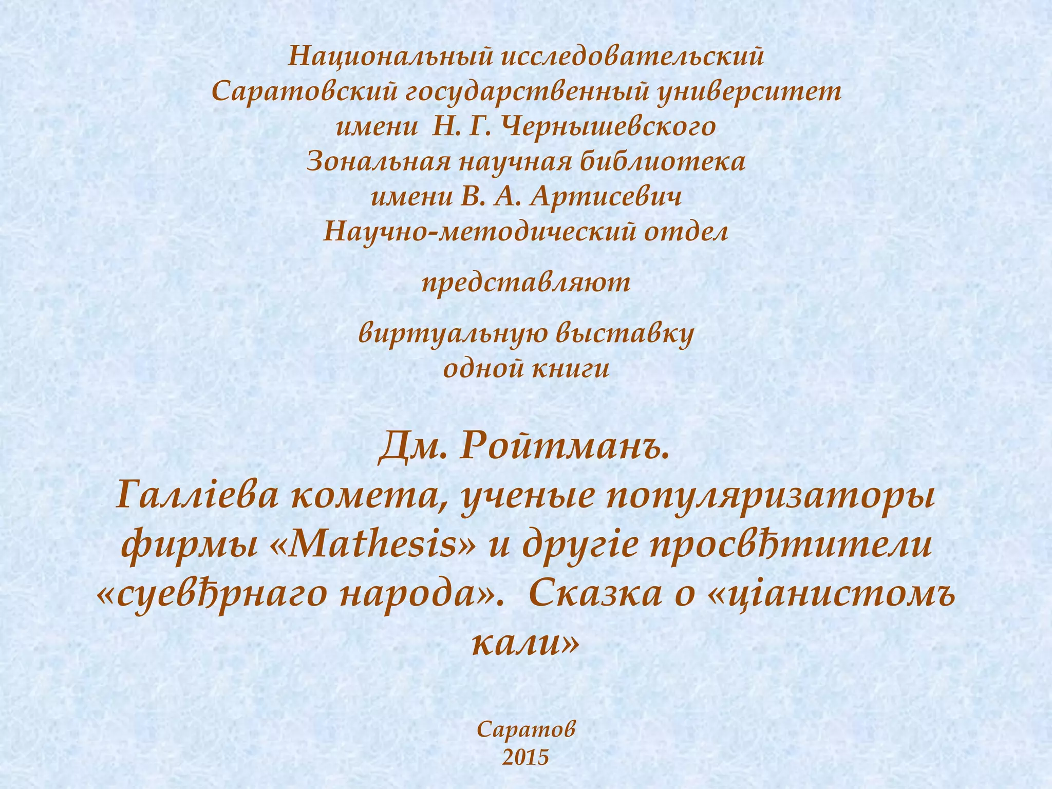 Документ описывает виртуальную выставку книги Дм. Ройтмана 'Галліева комета', организованную Саратовским государственным университетом. В мероприятии участвуют ученые и популяризаторы, такие как фирма 'Mathesis'. Книга была издана в Санкт-Петербурге в 1910 году и посвящена сказке о 'ціанистомъ кали'.