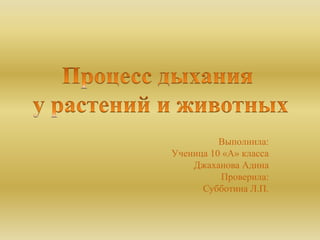 Документ описывает процесс дыхания как ключевой физиологический процесс для метаболизма живых организмов, обеспечивающий получение кислорода и выделение углекислого газа. Он рассматривает эксперименты, подтверждающие дыхание у растений, а также упоминает разные типы дыхания у различных организмов, включая одноклеточные, многоклеточные и хордовые. В заключении говорится о важности дыхания для энергетического обмена, фотографии и соединении процессов синтеза и распада, формирующих современную биосферу.