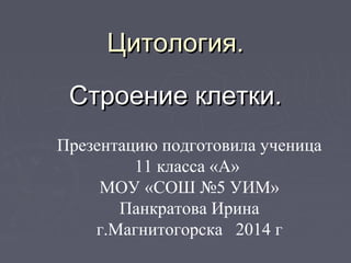 Документ представляет собой презентацию Ирины Панкратовой о цитологии, науке, изучающей клетки многоклеточных и одноклеточных организмов. В работе обсуждаются основные аспекты строения клеток, включая их оболочки, цитоплазму и ядро, а также функции клеток и их взаимодействие с окружающей средой. Описаны также различия между прокариотами и эукариотами, а также важность клеточной мембраны и методов клеточного обмена веществ.