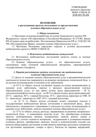 Документ устанавливает порядок расходования внебюджетных средств, полученных от платных образовательных услуг в мобу сош no 26, согласно российскому законодательству. Основные доходы поступают от оплаты таких услуг, и 63% общего дохода направляется на оплату труда работников, а остальные средства используются для развития материально-технической базы. Образовательное учреждение обязуется вести учет и контроль расходования средств, а за их правильное использование отвечает главный бухгалтер.