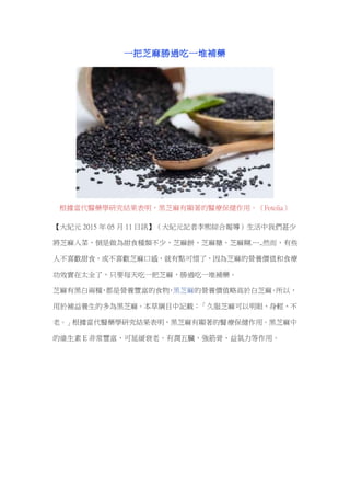 黑芝麻具有显著的医疗保健作用,营养价值高于白芝麻,每天食用一把可以胜过多种补药。其丰富的维生素E和多种营养素有助于延缓衰老、保护心脏、促进发育及改善消化。黑芝麻还具有降低胆固醇、增强血管健康和提升皮肤质量等多种功效。