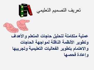 يعرّف التصميم بأنه عملية تخطيطية تهدف إلى تحقيق أهداف معينة باستخدام منهجية لحل المشكلات، وتتأثر بخلفية المصممين والقيود المحيطة. يتضمن التصميم التعليمي عدة مراحل، منها التحليل والتطوير والتنفيذ والتقويم، ويساهم في تحسين نتائج التعليم والتعلم. وأهمية نماذج التصميم تكمن في قدرتها على تحسين تجارب التعلم وتسهيل عملية التدريس.