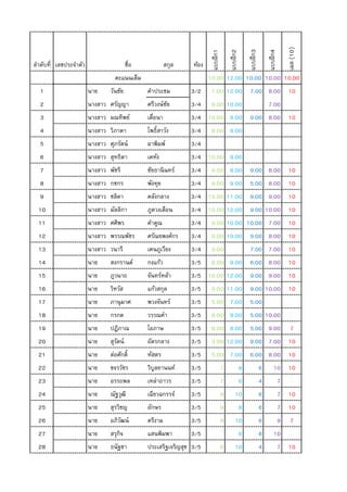 แบบฝึ ก1 แบบฝึ ก2 แบบฝึ ก3 แบบฝึ ก4 ลําดับที เลขประจําตัว ชือ สกุล ห้อง คะแนนเต็ม 10.00 12.00 10.00 10.00 10.00 1 นาย วันชัย คําประชม 3/2 7.00 12.00 7.00 8.00 10 2 นางสาว ศรัญญา ศรีวงษ์ชย ั 3/4 9.00 10.00 7.00 3 นางสาว มณทิพย์ เดือนา 3/4 10.00 9.00 9.00 8.00 10 4 นางสาว วิภาดา โพธิสาวัง 3/4 8.00 9.00 5 นางสาว ศุภรัตน์ ผาพิมพ์ 3/4 6 นางสาว สุทธิดา เคหัง 3/4 10.00 9.00 7 นางสาว พัชรี ชัยธานิ นทร์ 3/4 9.00 8.00 9.00 8.00 10 8 นางสาว กชกร พังทุย 3/4 9.00 9.00 5.00 8.00 10 9 นางสาว ชลิดา คลังกลาง 3/4 10.00 11.00 9.00 9.00 10 10 นางสาว มัลลิกา ภูดวงเดือน 3/4 10.00 12.00 9.00 10.00 10 11 นางสาว ศศิพร คําคูณ 3/4 9.00 10.00 10.00 7.00 10 12 นางสาว พรรณพัชร ศรัณยพงศ์กร 3/4 9.00 10.00 9.00 8.00 10 13 นางสาว วนารี เคนภูเวียง 3/4 9.00 7.00 7.00 10 14 นาย สงกรานต์ กงแก้ว 3/5 8.00 9.00 6.00 8.00 10 15 นาย ภูวนาถ จันทร์หล้า 3/5 10.00 12.00 9.00 9.00 10 16 นาย วิทวัส แก้วสกุล 3/5 9.00 11.00 9.00 10.00 10 17 นาย ภานุ มาศ พวงจันทร์ 3/5 5.00 7.00 5.00 18 นาย กรกต วรรณคํา 3/5 8.00 9.00 5.00 10.00 19 นาย ปฏิภาณ โอภาษ 3/5 8.00 8.00 5.00 9.00 7 20 นาย สุรตน์ ั อัตรกลาง 3/5 3.00 12.00 9.00 7.00 10 21 นาย ต่อศักดิ หัสดร 3/5 5.00 7.00 6.00 8.00 10 22 นาย ขจรวัชร วิบลยานนท์ ู 3/5 7 8 6 10 10 23 นาย อรรถพล เหล่าถาวร 3/5 7 6 4 7 24 นาย ณัฐวุฒิ เฉียวฉกรรจ์ 3/5 9 10 6 7 10 25 นาย สุรวิชญ อักษร 3/5 9 8 6 7 10 26 นาย อภิวฒน์ ั ตรีงาม 3/5 9 10 6 9 7 27 นาย สรุกิจ แสนพิมพา 3/5 6 8 10 28 นาย ธนัฐชา ประเสริฐเจริญสุข 3/5 6 10 4 7 10