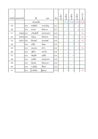 แบบฝึ ก1 แบบฝึ ก2 แบบฝึ ก3 แบบฝึ ก4 ลําดับที เลขประจําตัว ชือ สกุล ห้อง คะแนนเต็ม 10.00 12.00 10.00 10.00 10.00 29 นาย พงษ์พนธ์ ั วรรณเจริญ 3/5 6 8 6 9 30 นาย สถาพร จันทภาส 3/5 8 10 7 8 10 31 24865 นาย เกรียงศักดิ เหล่าทองสาร 3/8 7 7 7 7 10 32 24878 นาย วันชนะ ศรีกงพาน 3/8 3 8 4 7 10 33 24871 นาย พีระพงศ์ ทองแทพย์ 3/8 7 8 6 6 10 34 นาย อภิชย ั จังพล 3/8 9 9 6 7 35 นาย อมรเทพ คําจ่า 3/8 9 8 7 9 10 36 นาย วุฒิไกร เสกกล้า 3/8 2 9 7 37 นาย วัฒณสิริ มะสีโย 3/8 2 6 6 38 นาย ฤทธิชย ั ทองสงคราม 3/8 2 7 7 39 นาย อัครพล ปั สสามาลา 3/8 7 8 7 40 นาย จารุวฒน์ ั ลีโคตร 3/8 3 10 7 41 นาย ราชโยธิน ตุ่มทอง 3/12 7 9 9 10