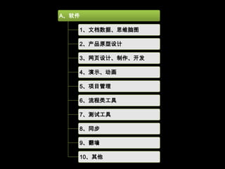 互联网产品经理常用软件与工作平台概述了一系列工具,包括文档处理、产品原型设计、网页设计与开发、演示与动画、项目管理等方面的推荐软件。这些工具被评估了实用性,强调了产品经理在不同工作环节中的关键职责。文章还提到,工具的选择应根据适合度而非优劣。