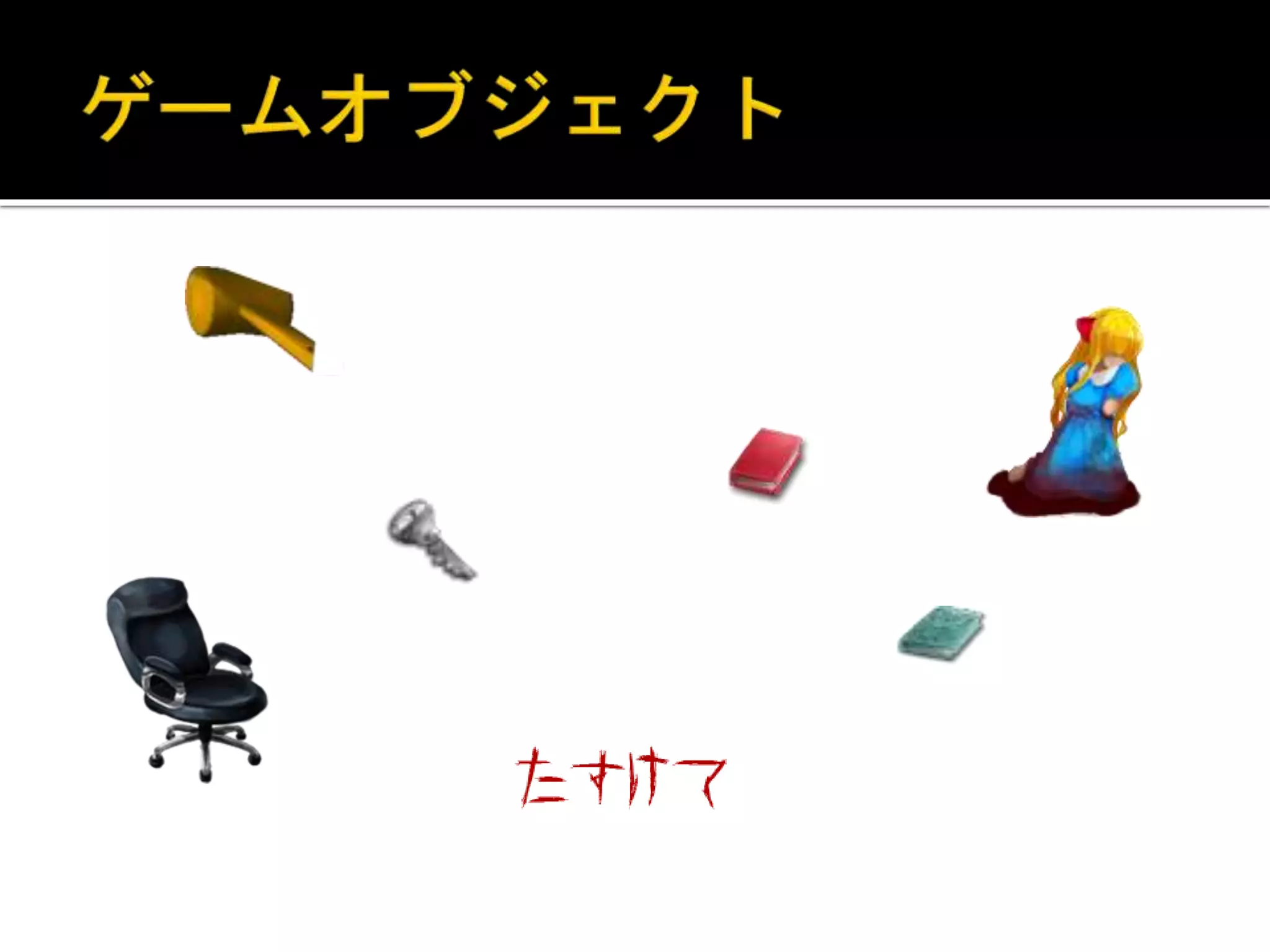 選択出来るオブジェクト(画像有り) カーソルがルーペに変わる置物。ドア、棚、アイテム等はこれです。 トリガー(画像無し) 表示はされませんが、キャラが触ったら処理を呼び出すオブジェクトで す。腕発見時等に使用しています。 追尾者用トリガー(特殊) プレイヤーに付いて来るキャラが触ったら処理が呼び出されるオブジェ クトです。主に成仏イベント用です。 フィルターの前に描画するオブジェクト フィルターで電気がついていない演出をしている時に電気のスイッチを 前に持ってくる時等に使用しています。
