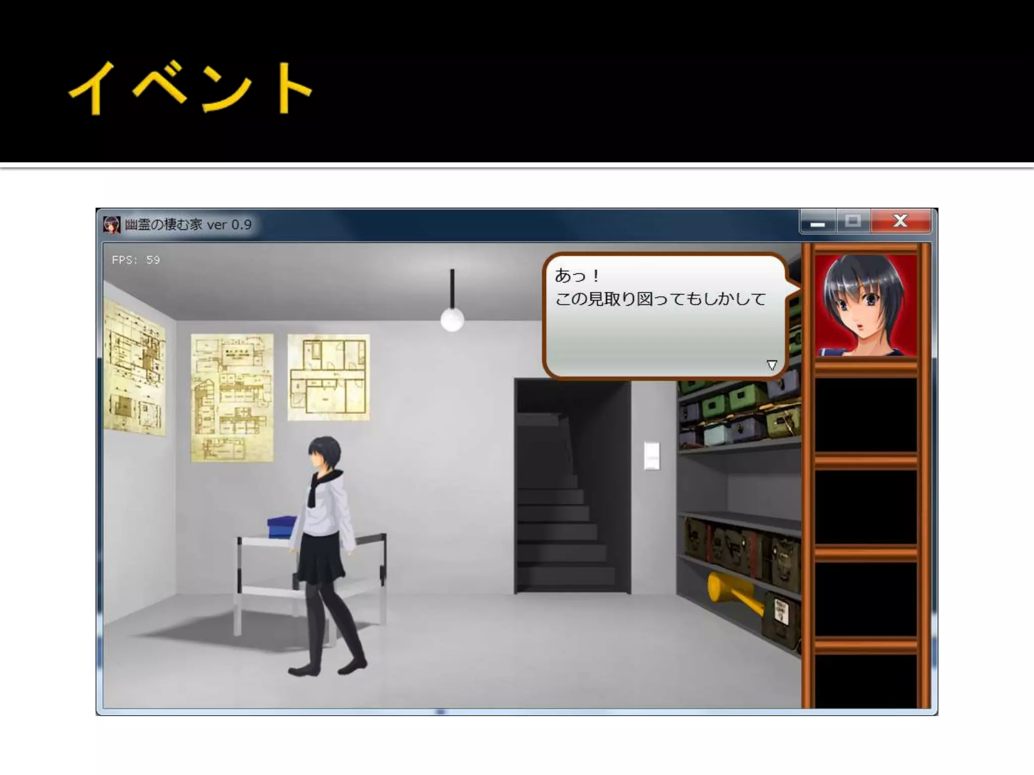 部屋の初期化 既に説明した様に部屋に入った際に初期化を行う 2. オブジェクト選択時用のスクリプト 部屋に配置するオブジェクトにプレイヤーが辿り着いた時に呼 び出すスクリプト。中で通常のセリフ等を呼ぶか、イベントを 開始するかの判断をしている時もあります。 3. イベントのスクリプト 主にプレイヤーが操作出来なくなる演出処理の進行を行ってい ます。基本的にはイベント番号 = 進行度で管理しています(単純 なゲームで良かった・・・ホッ)