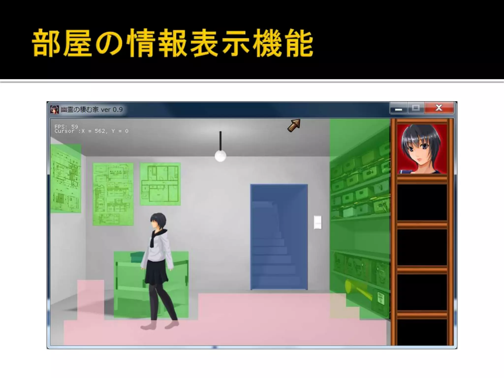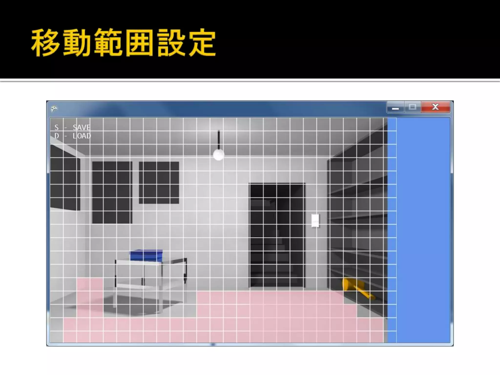 前のスライドの画像にある様に、部屋の情報 表示を切り替えられる様にしています。 歩ける範囲/マス